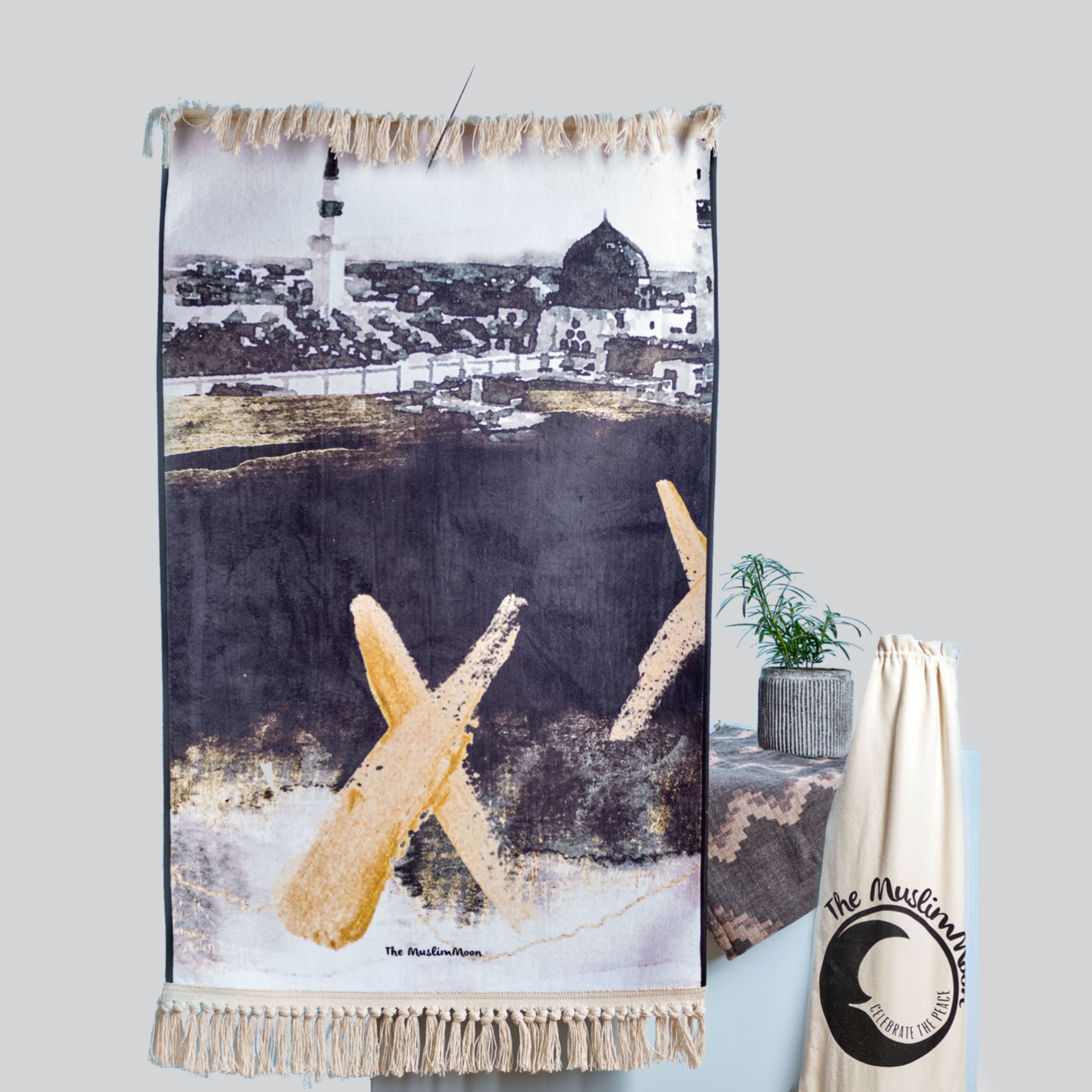 Our 'From the eyes of X' collection is inspired by Malcom X Shabazz's spiritual journey of Hajj. This collection of prayer mats prominently features the Masjid Al-Nabawi from the 1960s. The monochrome design is accented with a golden X that represents equality. This is a limited edition series with only 200 prayers mats