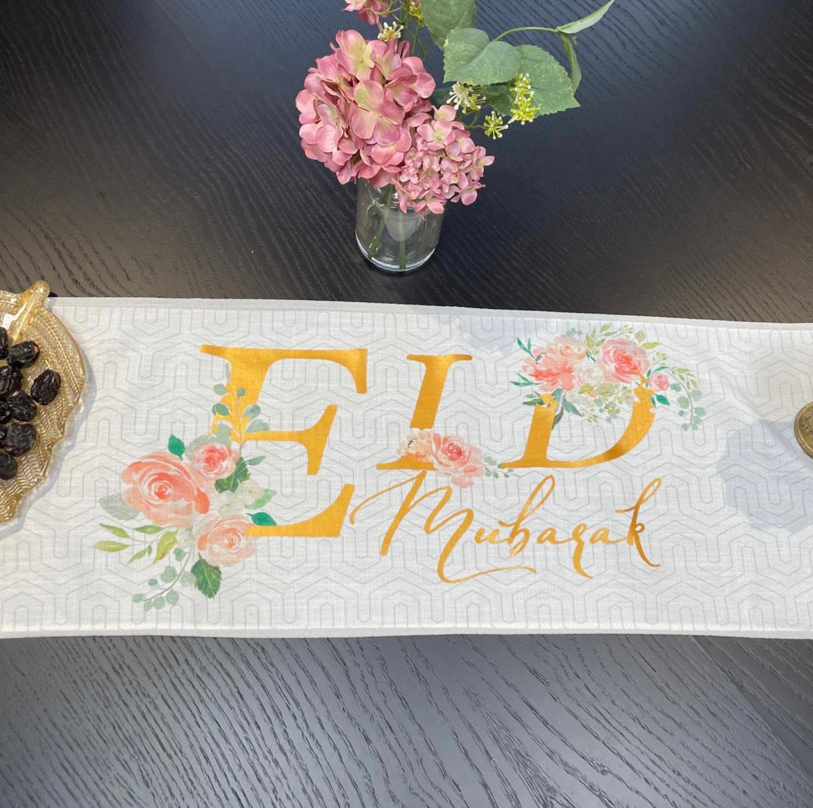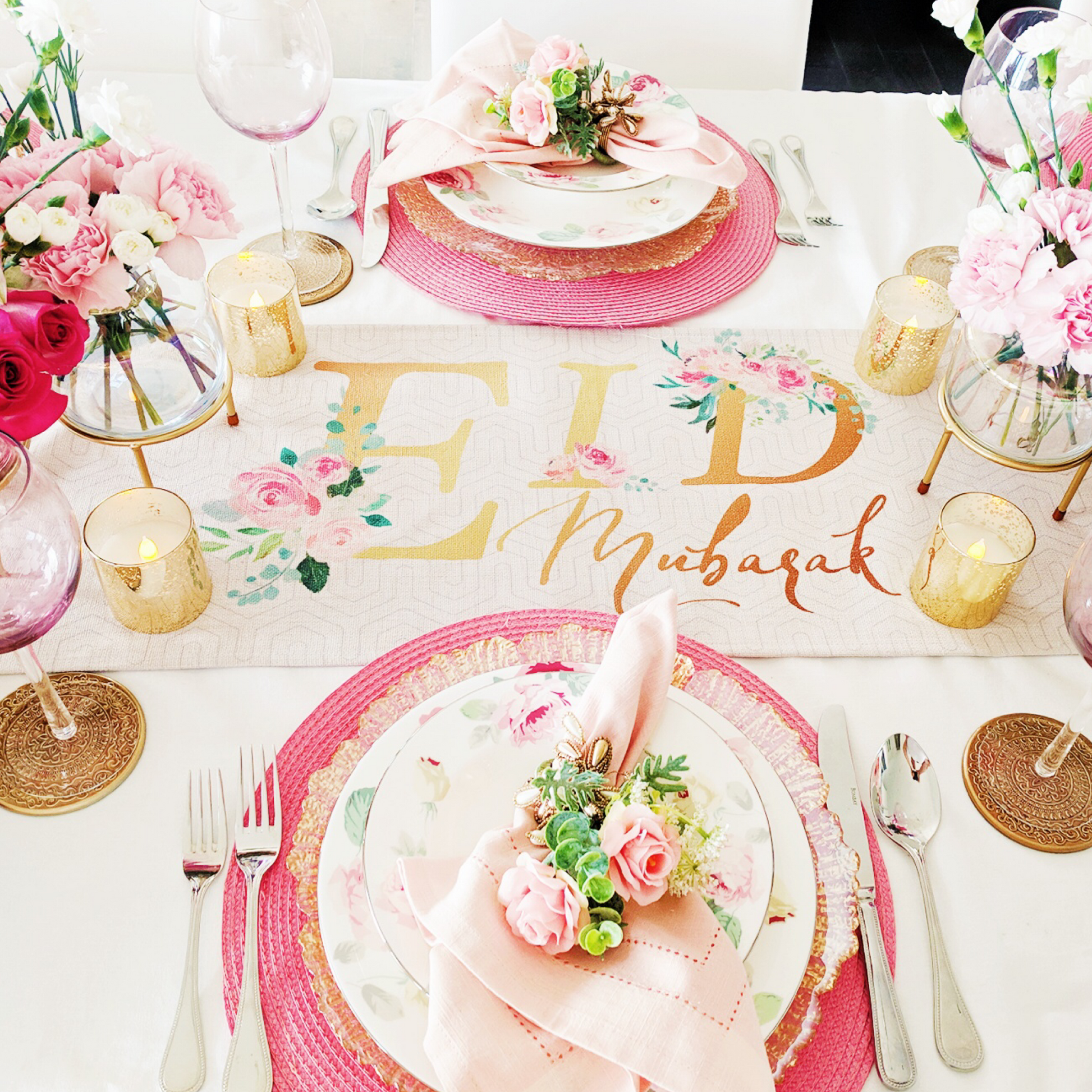 A profusion of peach and pink florals accenting a richly shaded yellow tones or gold foil script Eid Mubarak on a geometric patterned off-white and light grey background creates a sophisticated balance for the modern and luxe festive tablescape.