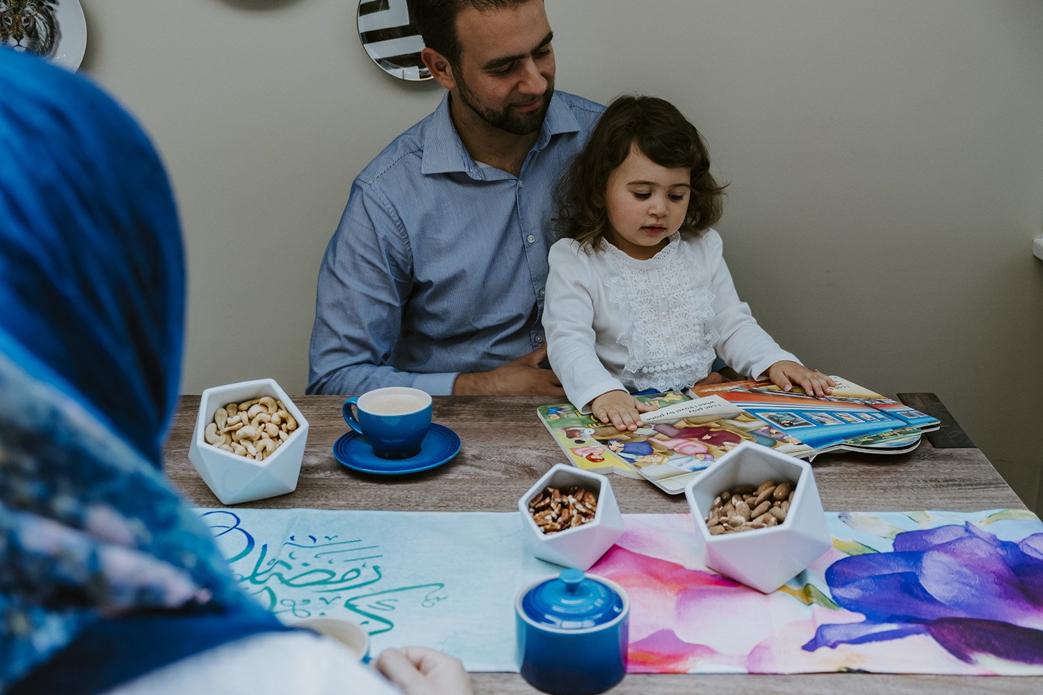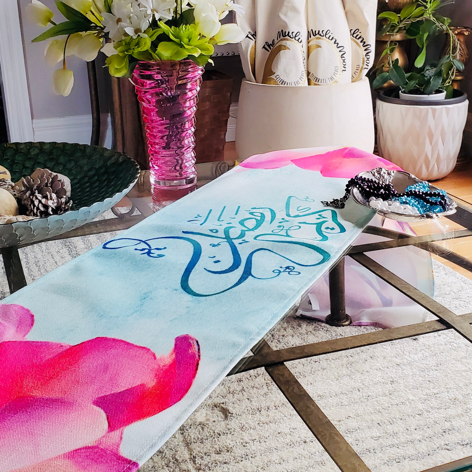 Graceful pink and purple freesias sweep across the sky blue background of our Ramadan Kareem runner. Watercolour florals and an elegantly scripted Arabic calligraphy make for enchanting details on this piece.