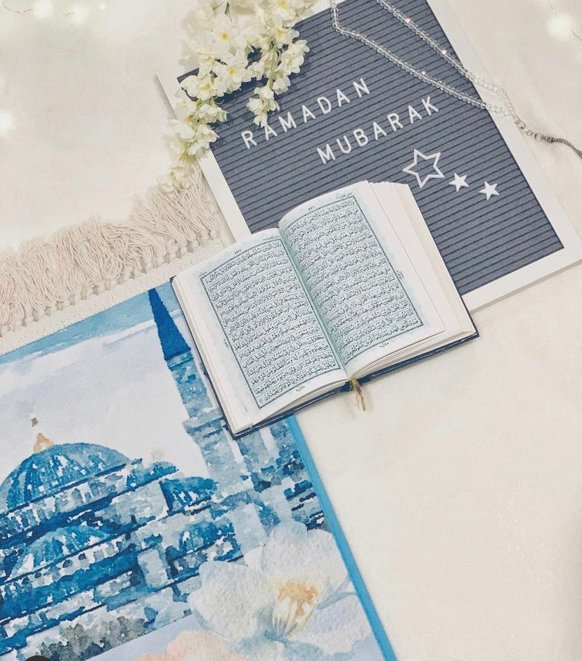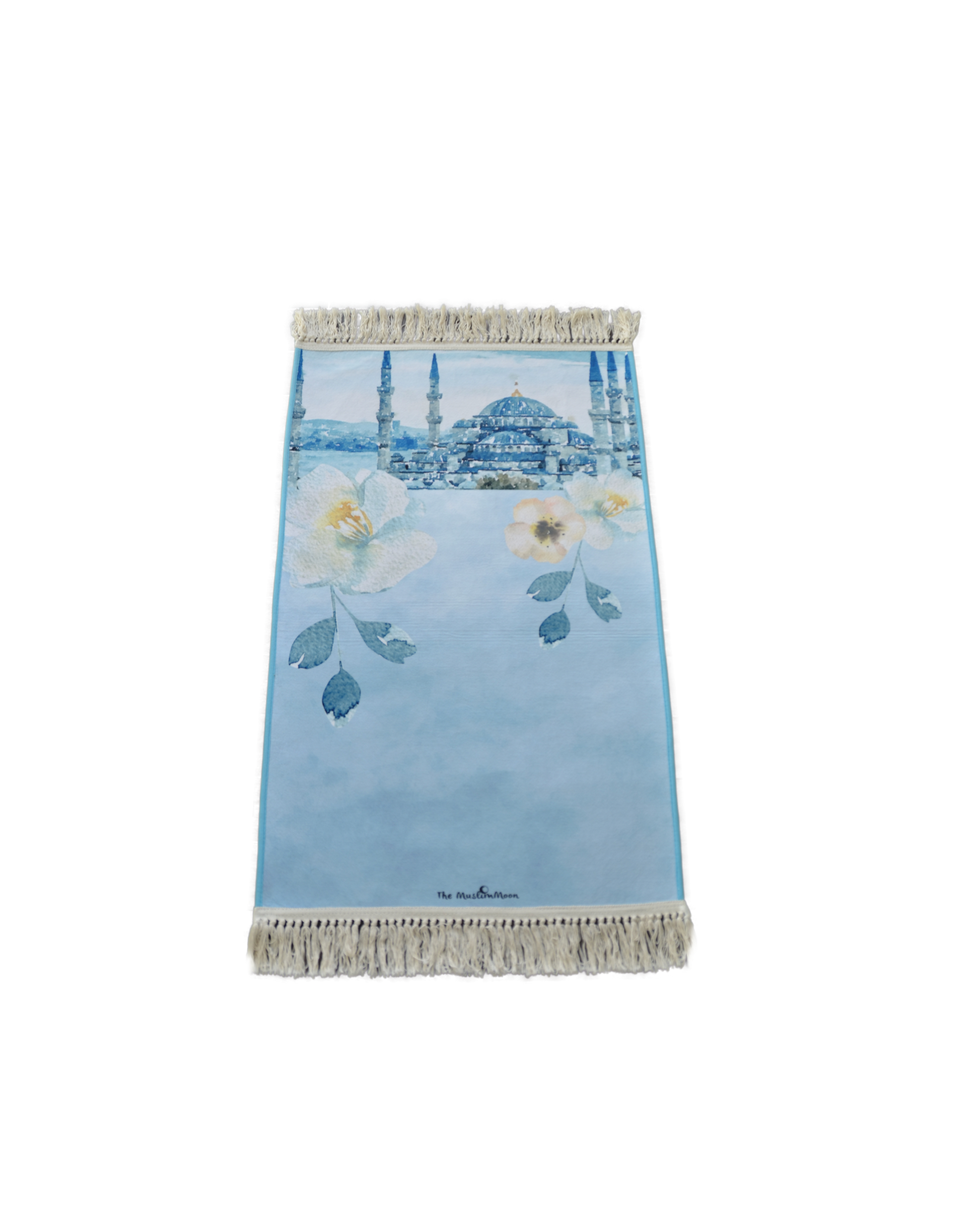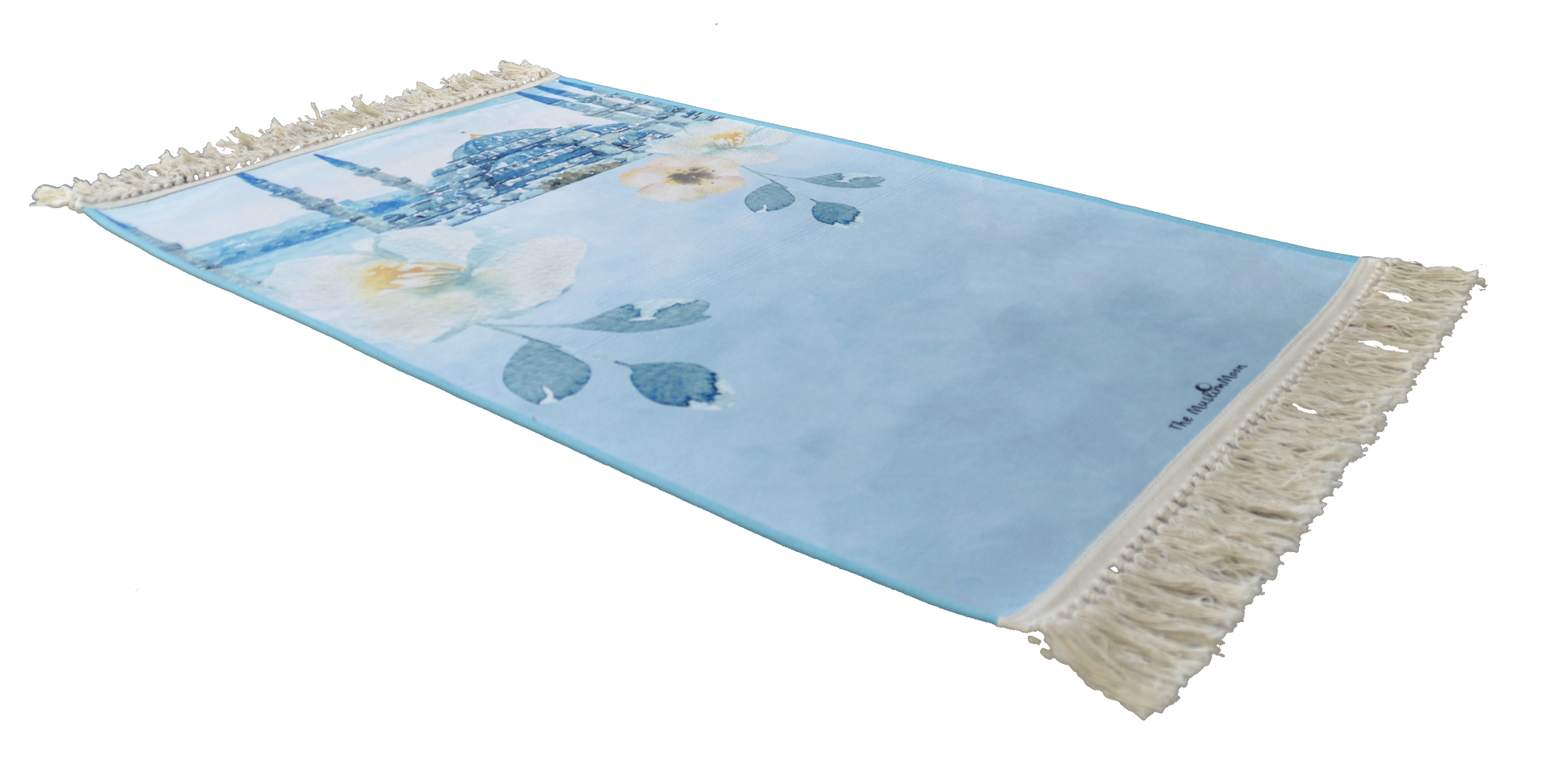 Inspired by the hand-painted blue tiles that adorn the interior of the Sultan Ahmed Mosque, this prayer mat depicts the rich history of Islamic architecture in a dreamy blue palette.